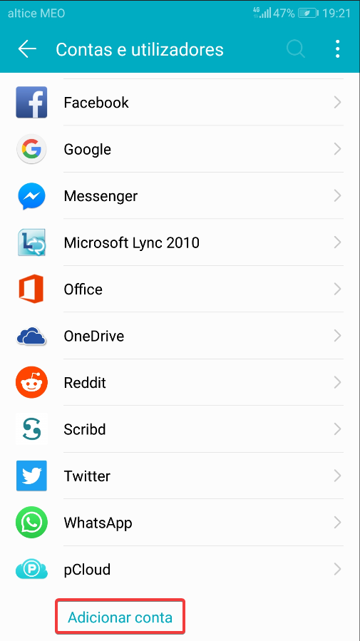 - Clique na opção Definições > Contas e utilizadores e Adicionar conta.